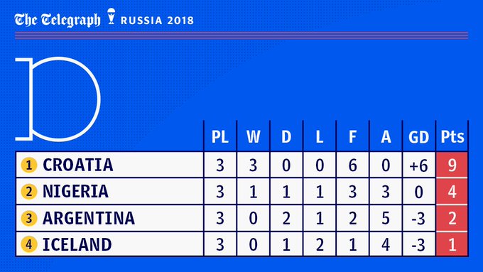 Croatia has already qualified and would need a remarkable collapse to finish anywhere but the top. The race for second is complicated. Nigeria will definitely qualify if they beat Argentina; if they draw, they will still go through provided Iceland do not beat Croatia or win by more than a two-goal margin. If Iceland and Argentina both win, it would come down to goal difference, with Argentina needing to win by at least one more goal than Iceland to overhaul them. A draw is no good for either of them.